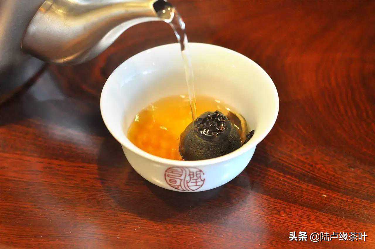 3.沿杯壁注水浸润。与对着柑皮冲泡大同小异,一样只是在泡陈皮,而里面的普洱茶却“安然无恙”。