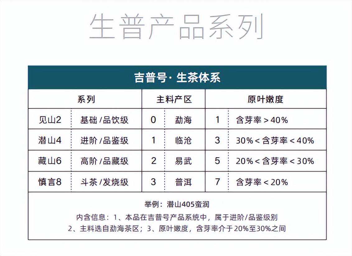 吉普号的茶品自成体系,以数字区分。2、4、6、8为生茶,3、5、7、9为熟茶。