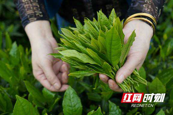 刚采摘下的新鲜茶叶,将经过独特工艺制作成安化黑茶。