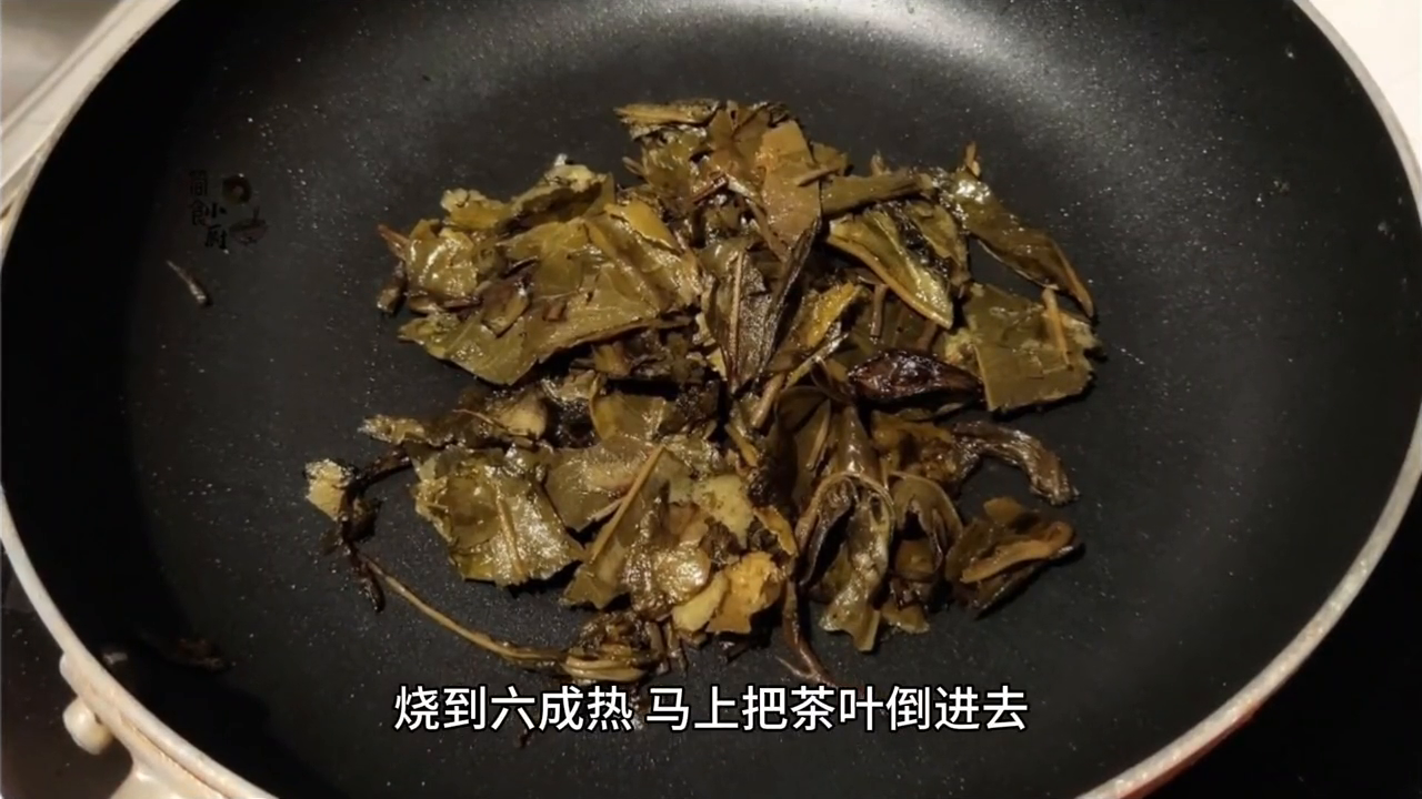 →第二步、锅里放几十克食用油,烧到六成热马上把茶叶倒进去迅速翻炒,一边炒一边提起来抖动,这样茶叶就会迅速膨胀就像炸油条一样。
