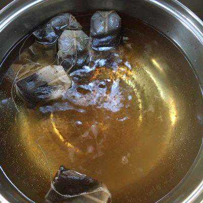 2、热锅烧开水,放入茶包,白糖煮2分钟,关火焗5分钟,捞起茶包