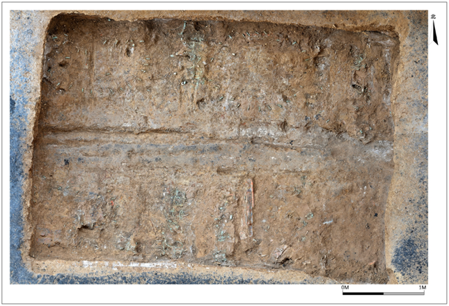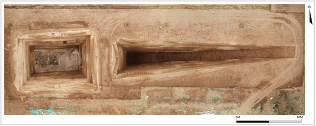 M4是由斜坡墓道、过洞、天井、甬道、土圹墓室五部分构成的“L”形斜坡墓道竖穴土圹墓,全长42.7米。甬道内有木椁箱结构的外藏椁,椁内出土有陶缶、罐、方仓等。葬具可见一椁一棺,木椁由头箱、东西边箱和棺箱组成。