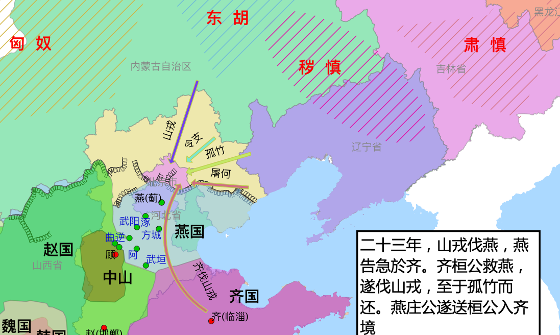 山戎伐燕,燕向齐国求救,齐桓公出兵救燕,并伐山戎至孤竹然后回来了。然而山戎伐燕并不是自己来的,应该是将孤竹等臣服的国家一起带上过来的,所以《国语齐语》上说“遂北伐山戎,制令支,斩孤竹而南归”。这里说到了“斩孤竹”,千年古国孤竹国从此就从中国历史中消失了。