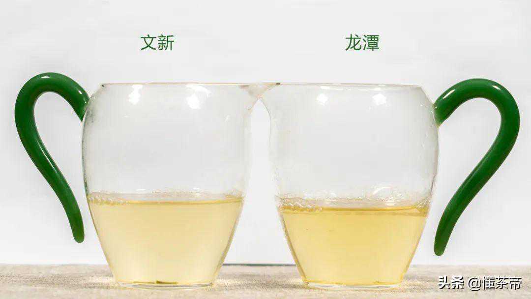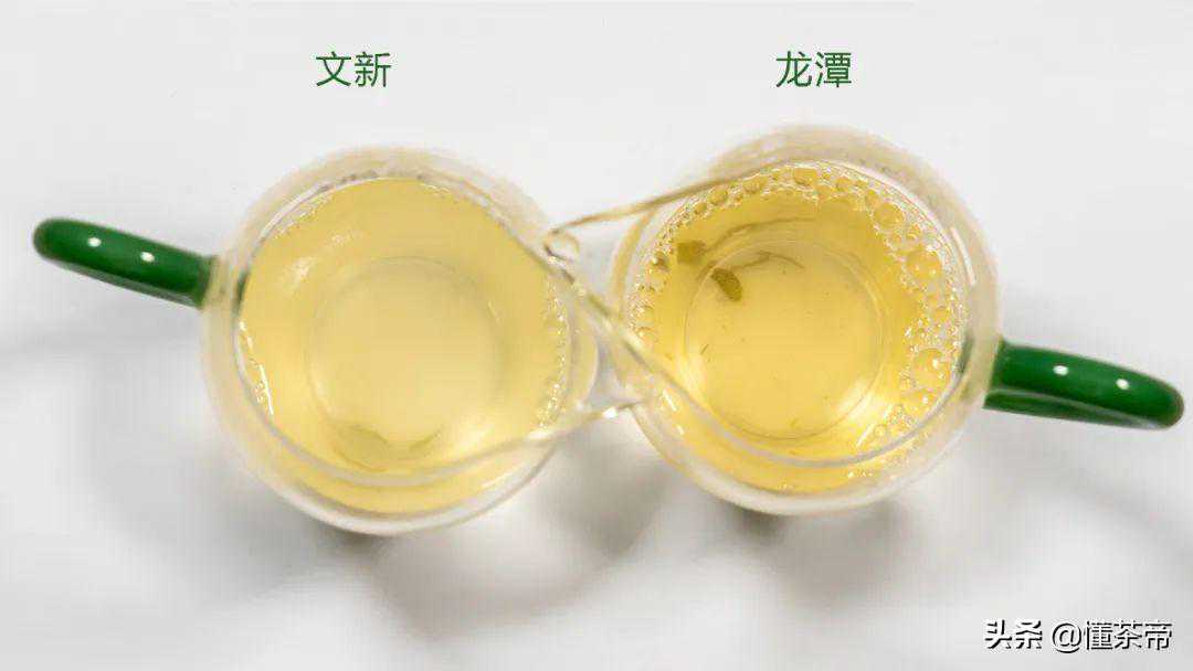 文新“印象中原”香气上是鲜香带有花香,滋味鲜爽浓滑,有明显的甘甜;龙潭“绿茶家香”的香气是粮食香带豆香,滋味浓强,有苦涩感,同时有回甘生津。