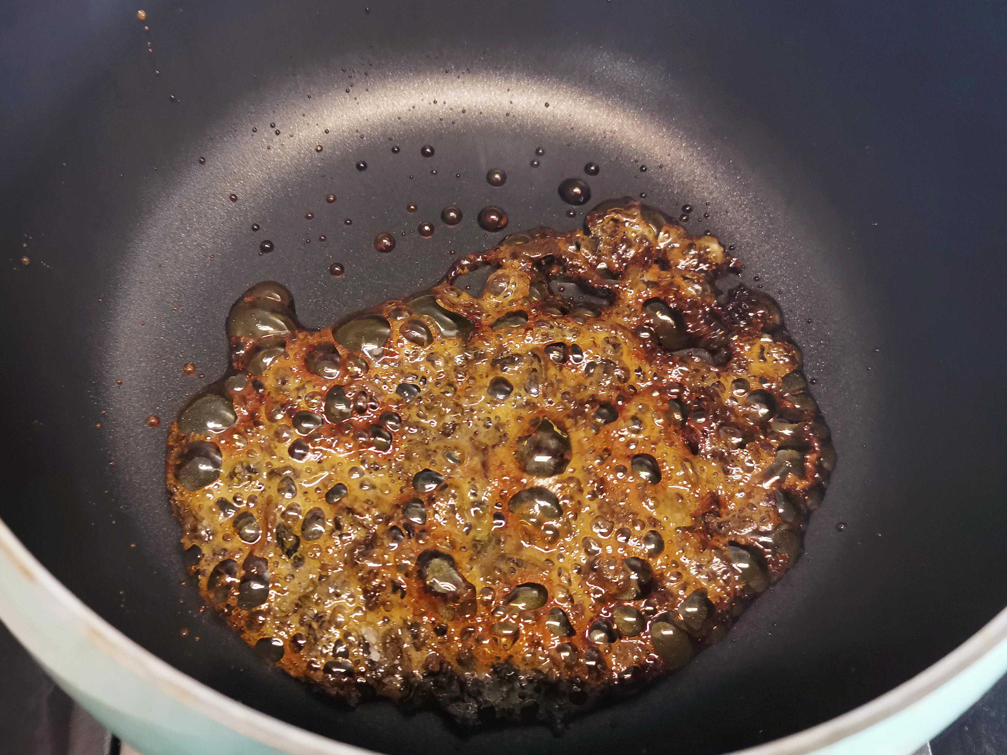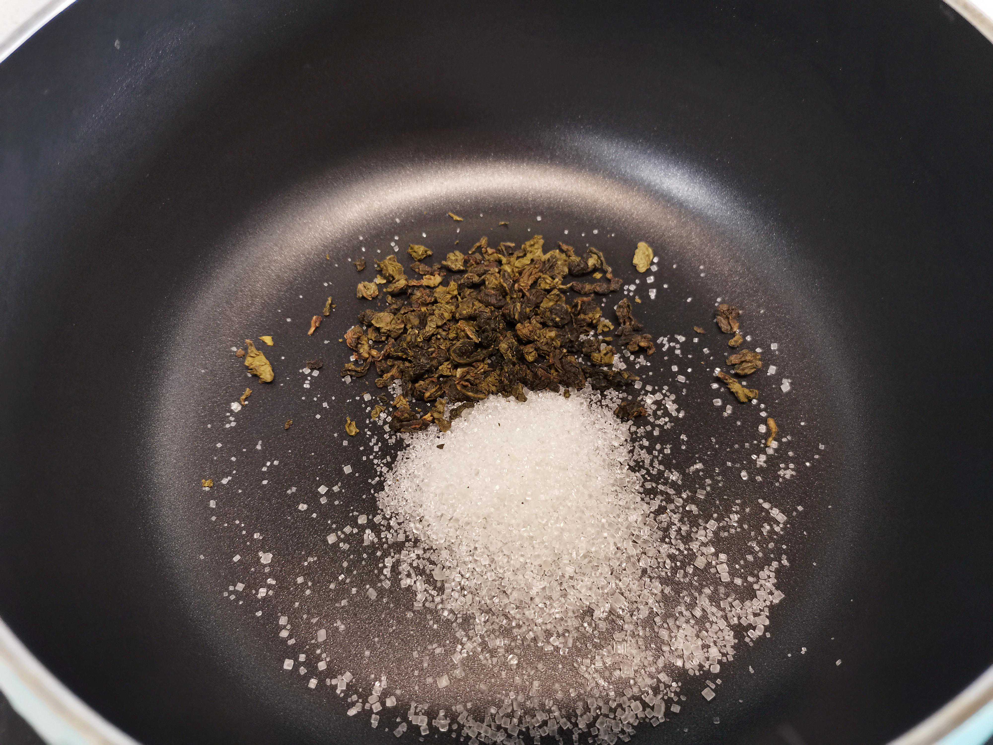 第二步:开小火慢慢慢炒制茶叶和白砂糖,直到白砂糖完全融化并色泽变成焦糖色为止,在炒制茶叶和白砂糖时要不停地搅拌,以免粘锅。