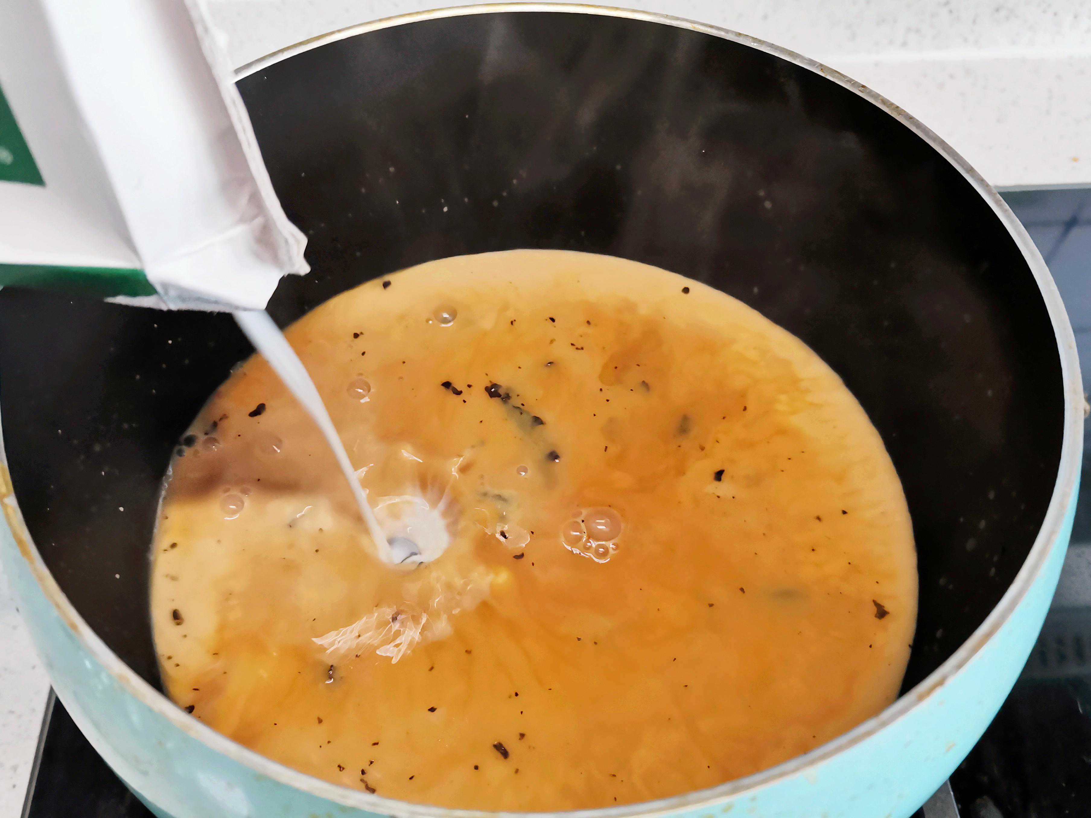 第四步:最后在煮锅中加入1盒纯牛奶煮2分钟搅拌几下就可以关火了。