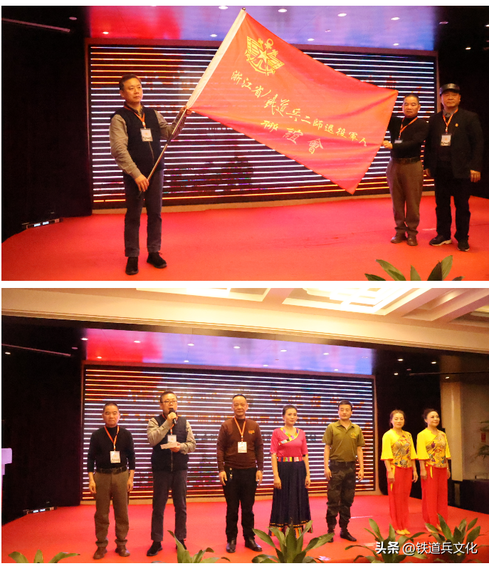 随后,铁二代代表单冲(原铁二师十团团长、铁二师副师长单宝平的次子)讲话,他代表家父祝贺大会圆满成功,并向大家问候。黑龙江战友高德林(原七团二营通讯班)、瑞安会长薛建光、嘉兴会长周福明、海宁秘书长茹建甫、桐乡战友王佩根、湖州战友姚林宝(浙江省作家)、安吉会长俞泽洪、嘉善秘书长张荣福、安吉战友严荣火(安吉白茶浙江省非物质文化遗产传承人,他向大会赞助了安吉白茶)、杭州战友何永静、富阳战友董德干(他为大会赞助了白酒和红酒)、温州战友李忠良(鹿城区卫生局的干部)等战友作了热情洋溢的发言。陈伟南会长宣布浙江省铁二师退役军人艺术团成立(团长张国松、副团长薛建光、李伟群。艺术总监:李和建、毛建红、冯红),并向艺术团成员授旗。同时宣布明年的浙江省铁道兵二师退役军人联谊会在富阳举行,并向富阳战友董德干交接了铁道兵二师退役军人联谊会的会旗。