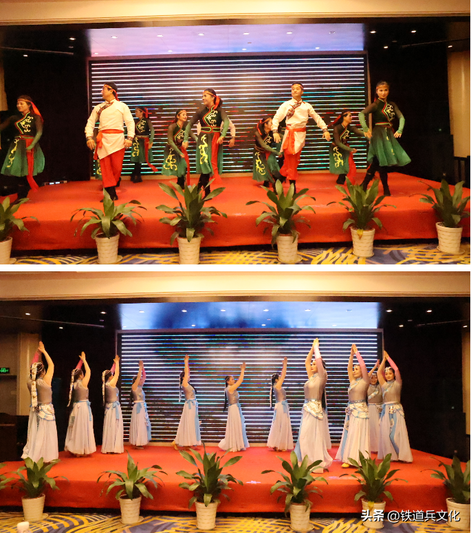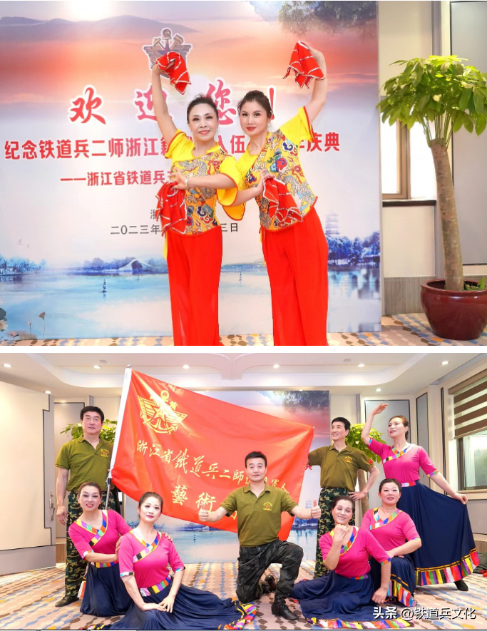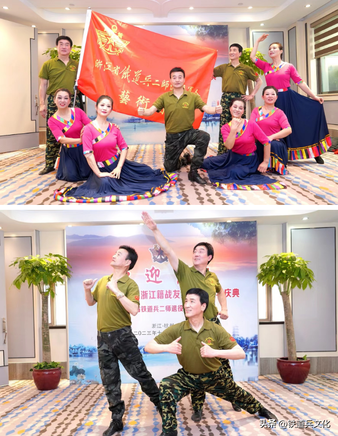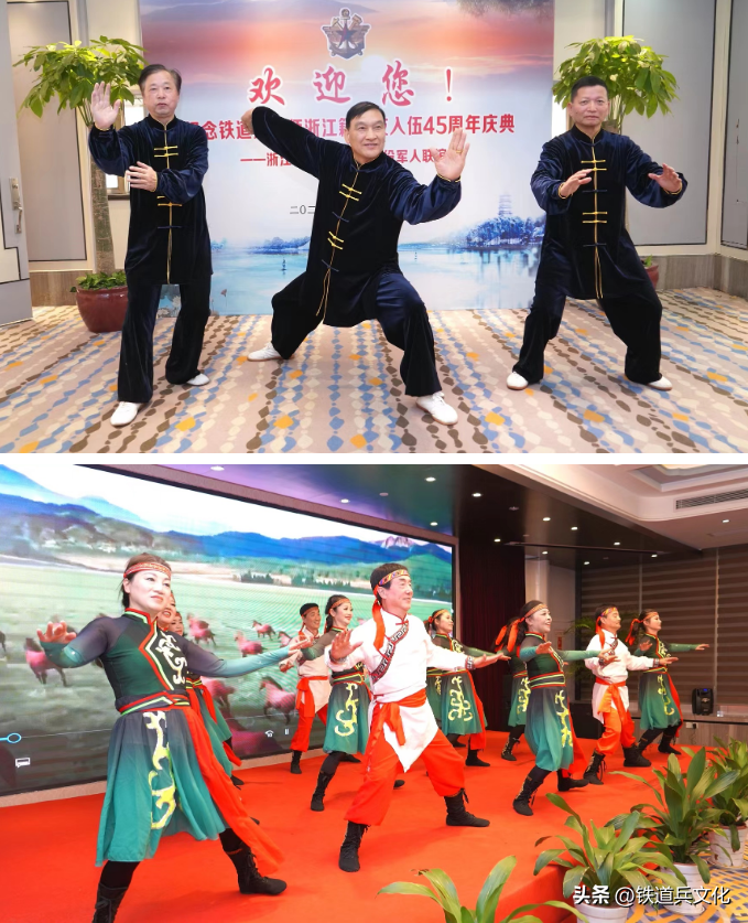 接下来大家欣赏了浙江省铁二师退役军人艺术团精彩无限的演出。开场舞《好日子》。今天是个好日子,是纪念铁道兵二师浙江籍战友入伍45周年纪念日。军人情结永在,几度梦回军营,战友情深似海。第二个节目瑞安战友洪卫民男声独唱《绿色军衣》。绿色军衣象征着生机与希望,代表着勇气与坚定。让我们一同领略军衣的魅力,感受其中蕴藏的故事和情感。第三个节目藏族舞蹈《太阳姑娘》,表演者:李伟群、周红月等人。藏族人民特别热情好客。藏语,扎西德勒(吉祥如意),广为熟知,翻译成汉语是幸福、安康的意思