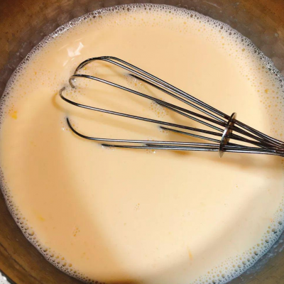1、将鸡蛋打入碗中,加入50g细砂糖,倒入牛奶搅拌均匀。