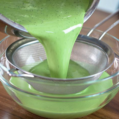 2、取一小碗,将少许蛋液加入抹茶粉,搅拌过筛抹茶糊至细腻无颗粒。再将抹茶糊倒回到蛋奶液中,加入玉米油搅拌均匀。
