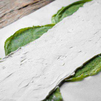 7、饼皮上下没抹奶油的地方向中间折,从左到右卷起来。卷完放入冰箱冷藏定型,撒上抹茶粉。抹茶毛巾卷完成!