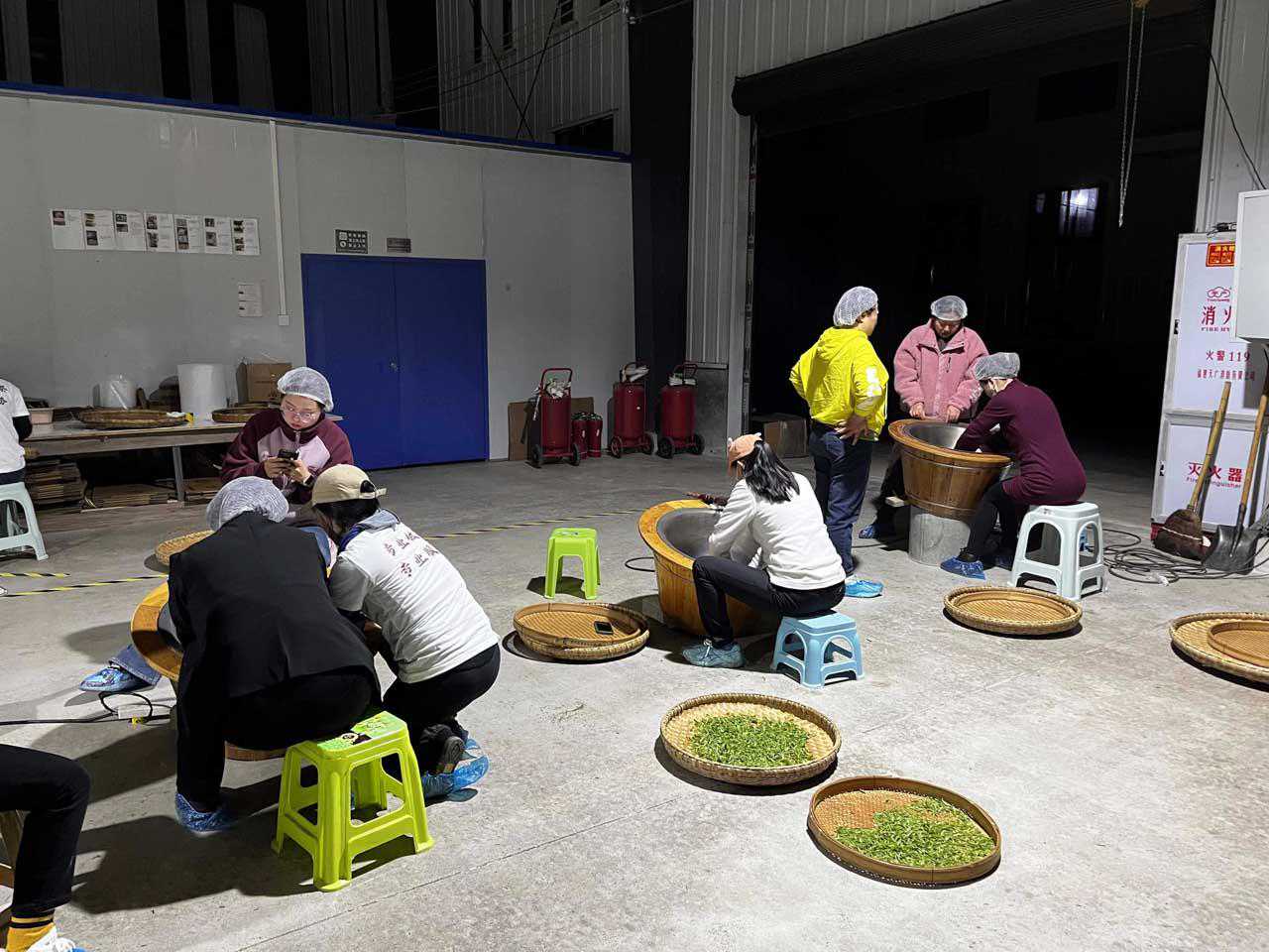 2023年3月28日晚上9点,贵黑茶业工作人员将当日收来的茶青进行萎凋。(南方周末记者施璇/图)