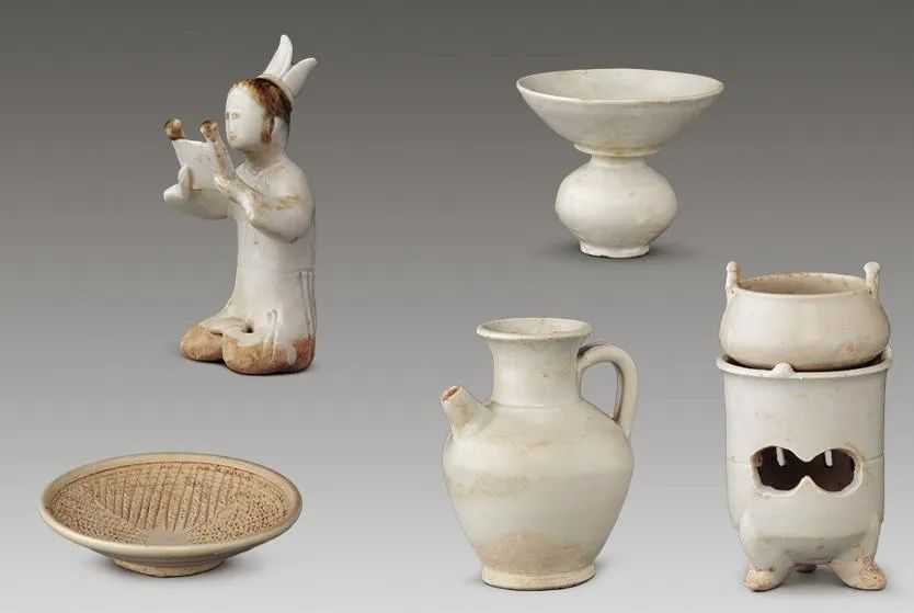 眼前这套茶具,品类丰富,既有煮茶用的风炉茶鍑、研碾茶末的茶臼、盛茶渣的渣斗和点茶用的茶瓶,还有一件手捧长卷的白瓷人像。如细观之、俯耳听之,又会发现每一件小物似乎都在讲述着茶的故事。