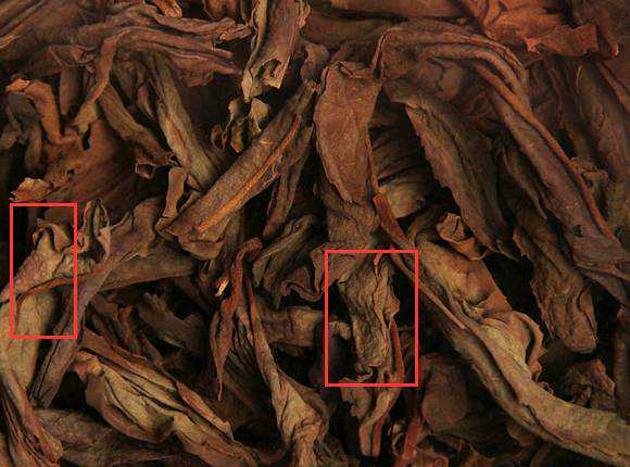 有些较老的叶子,叶面破裂,叶脉一根根分离,有如将干叶子长期泡在水中那种碎烂的样子。但是,有些熟茶若渥堆时间不长,发酵程度不重,叶底也会非常接近生茶叶底。