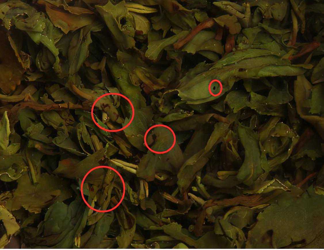 冲泡后,叶片上出现明显的焦黑炭化的现象,或在叶片上,或是细小的黑点。这样的叶底一般还会伴有糊味甚至焦味。