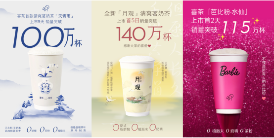 基于自身的产品创新研发实力,喜茶使用这些茶叶搭配真奶、真果等原料,推出了芝芝金凤茶王等芝士茗茶系列、多肉葡萄等果茶系列、烤黑糖波波牛乳等牛乳茶系列、绿妍轻乳茶等轻乳茶系列等经典产品。这些产品创新搭配展现了每款茶叶的独特风味,深受消费者喜爱。今年以来,喜茶延续轻乳茶系列推出的天青雨、月观、芭比粉·水仙等茗奶茶产品,使用金牡丹乌龙茶、铁观音、水仙等无香精真茶底搭配真奶,带来传统茶叶的全新体验,上市即火热。其中芭比粉·水仙首周销量近300万杯,刷新喜茶清爽茗奶茶系列最新销售记录。