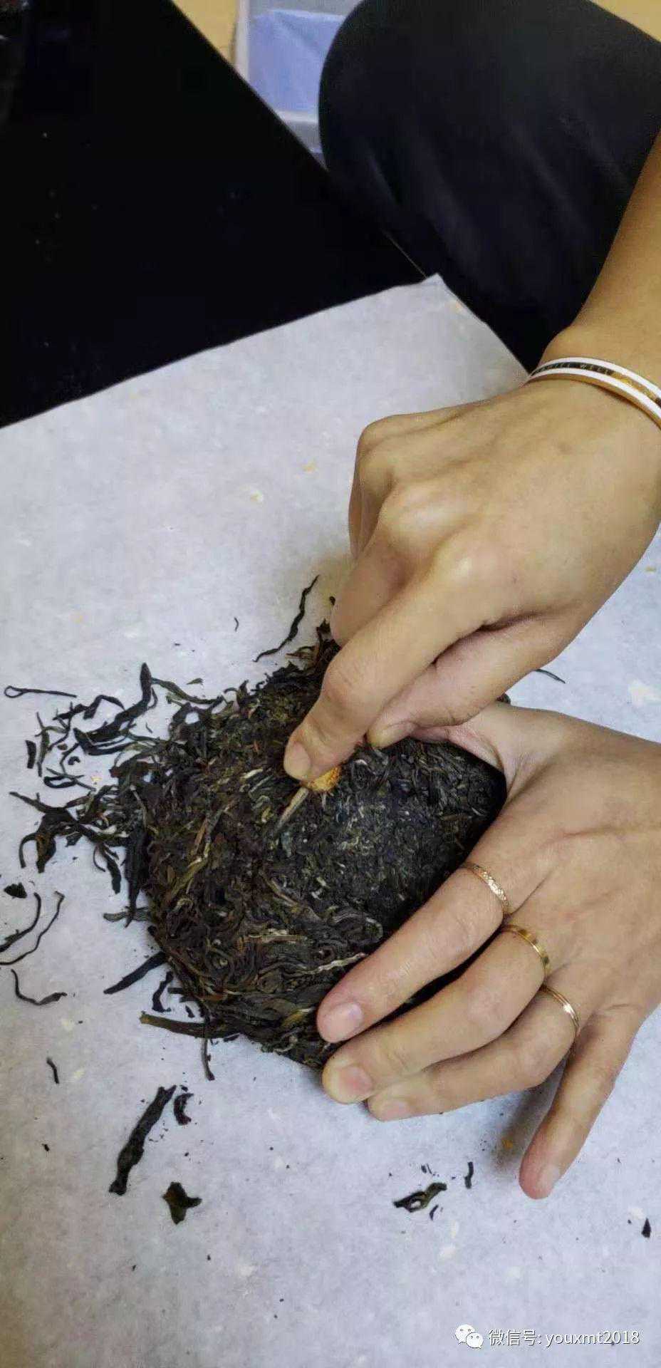 注意事项:在撬茶的过程中,手要和茶针或茶刀向同一方向,按住茶饼的手要在后方,与茶针成平行角度,以防用力过猛,失手扎伤自己。