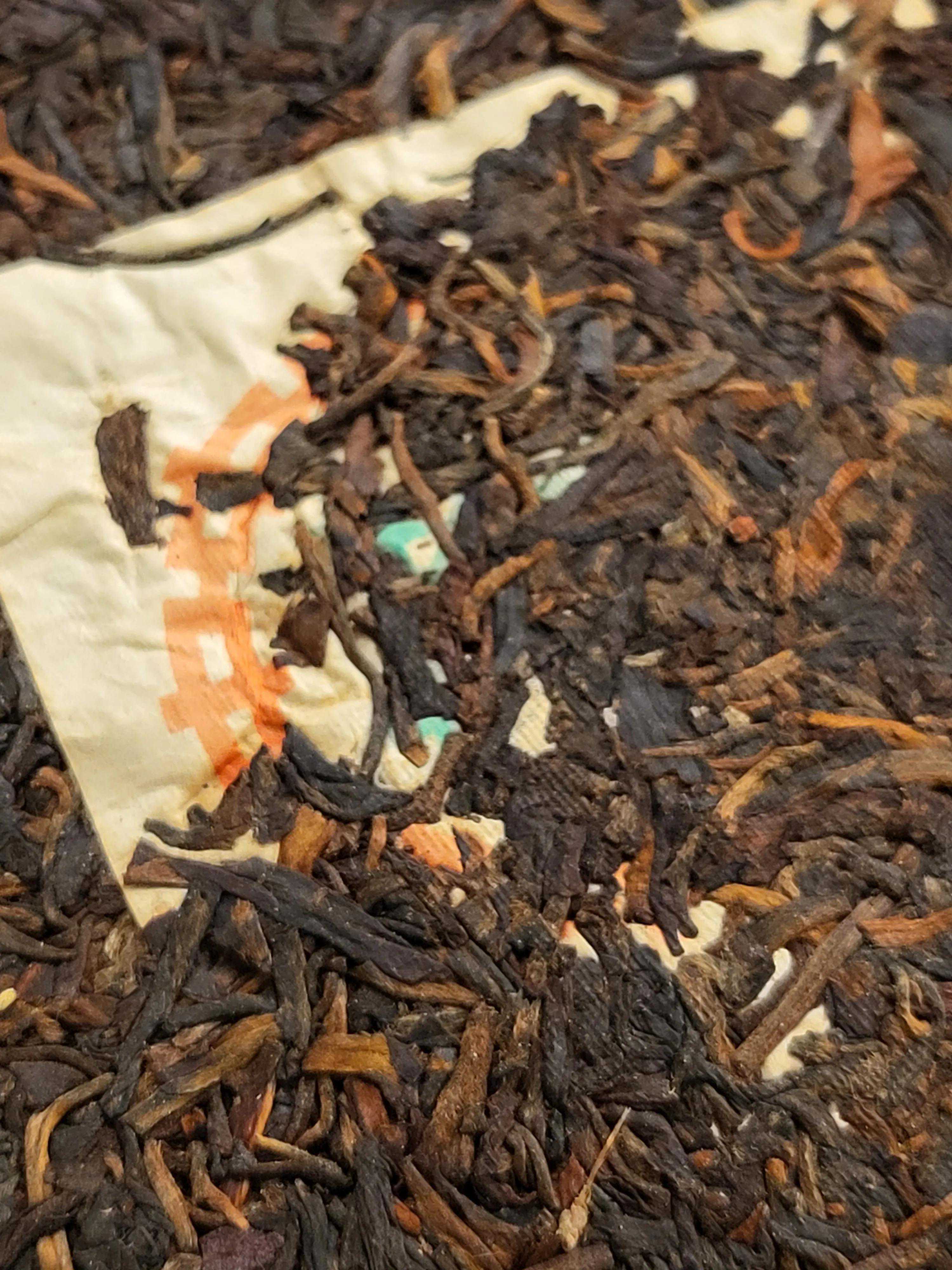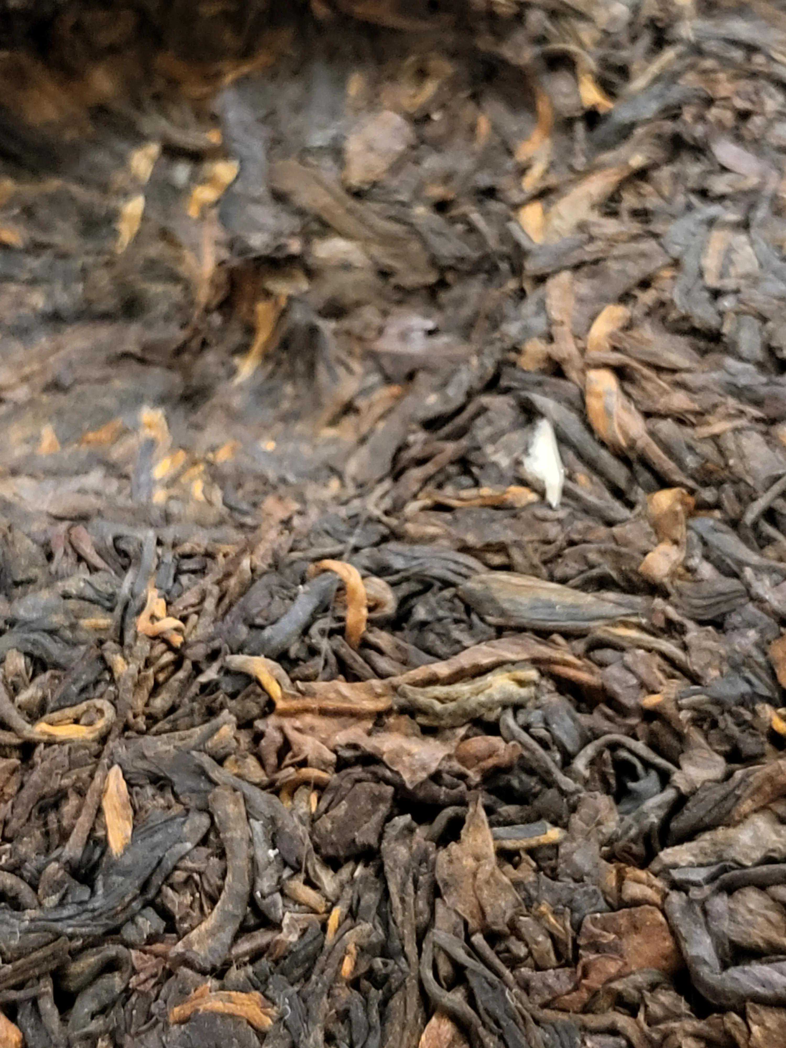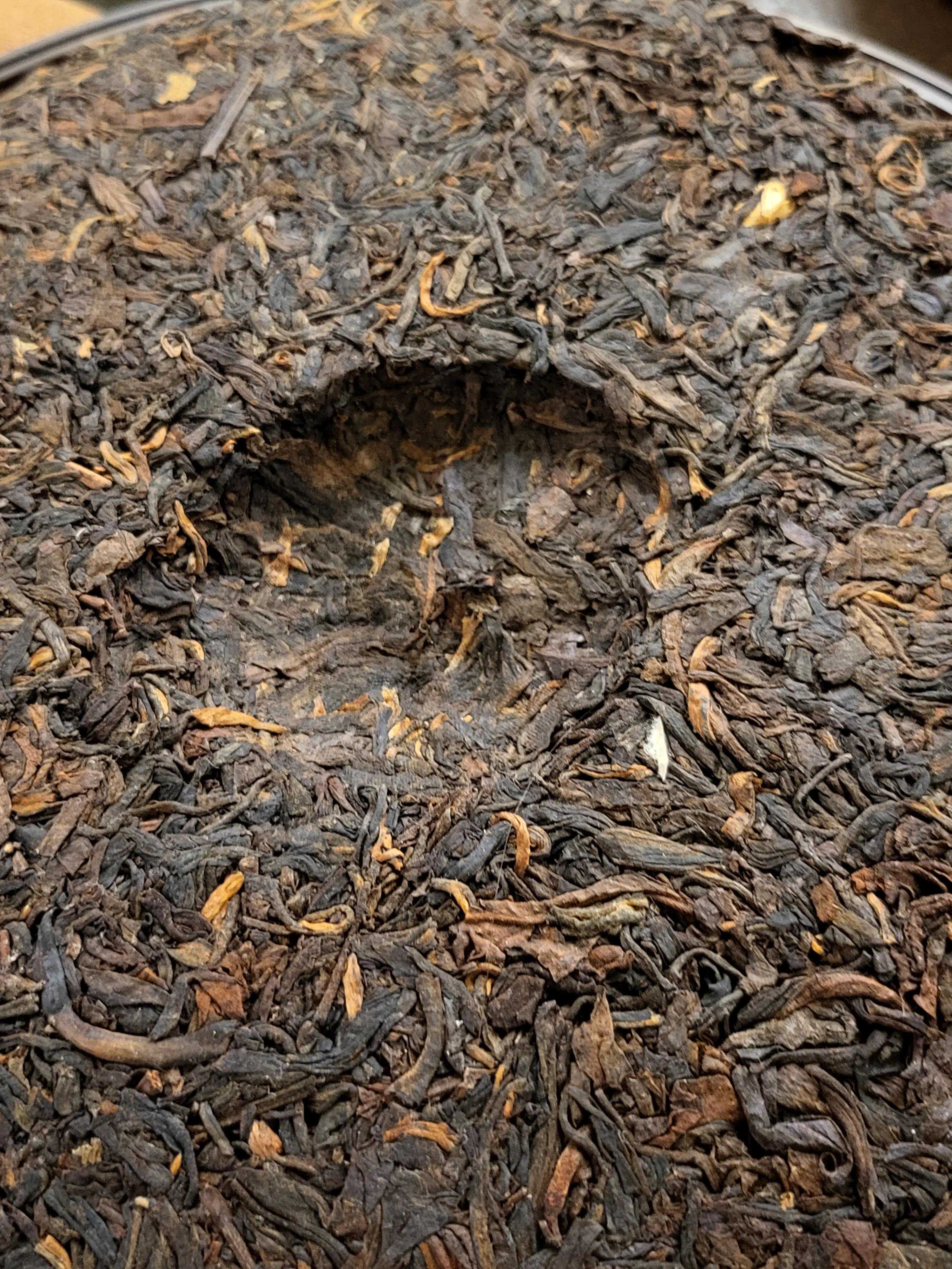 茶饼茶条乌黑油润,毫芽部分经年累月转化为金色,正所谓金毫毕现。茶条肥硕粗状,间中茶骨嵌在饼中,体现国营厂时代拼配茶品的突出特点。通过高清大图,饼面的布纹清晰可见,这也是勐海茶厂那个时代的茶品特点。同时提醒爱茶人注意国营厂时代内飞的压制是深埋入茶的,这个特点通常用于同期茶品的作假厂家和作假年份的反推证据。本文不再引用常规茶书的图片,敬请谅解。