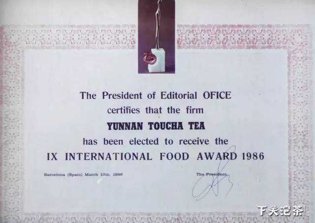 1986年,在西班牙的巴塞罗那第九届世界食品评奖会上,云南沱茶荣获世界食品金冠奖,次年,又在巴塞罗那世界食品评奖会上卫冕成功。1987年还获德国杜塞尔多夫第十届世界食品金奖,1989年获法国食品金奖,1998年再获美国食品金奖。从此,云南沱茶在整个欧洲名声大噪,美国、加拿大等国家的茶商也纷纷来订购云南沱茶。