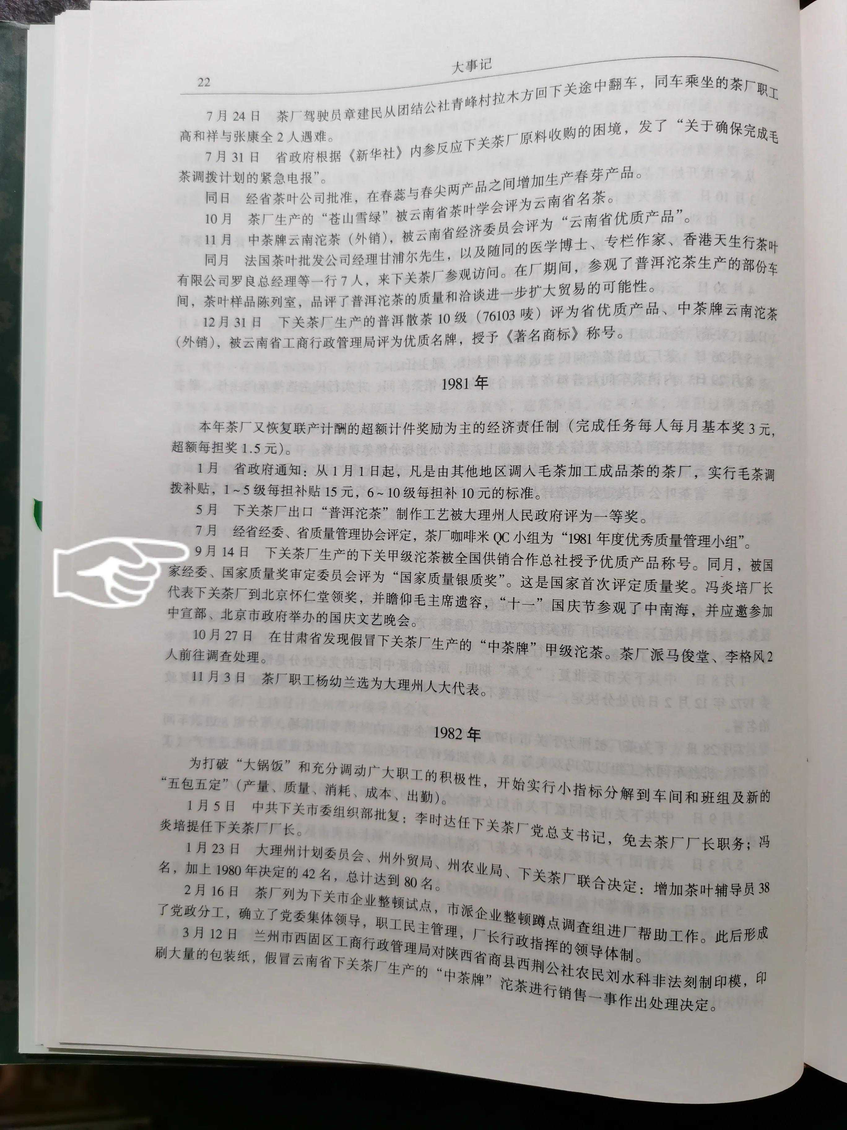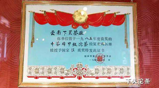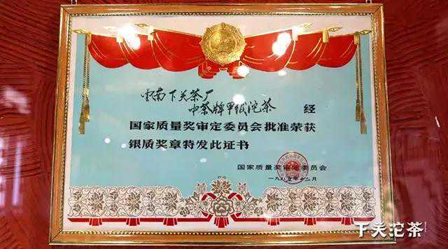 《云南省下关茶厂志1941-1998》是中国茶企里不可多得的一本志书,史料详实准确,看下关茶厂的历史此志是第一选择。1976文革结束后的十年,下关茶厂经历了什么?我把《关茶陈香,下关茶厂的八十华章(二)》中轻轻带过的这段重要历史还原如下:1981年9月14日,下关茶厂生产的云南沱茶(甲级)被国家经委、国家质量奖审定委员会评为“国家质量银质奖”。厂领导冯炎培代表下关茶厂到北京怀仁堂领奖,还在“十一”国庆节参观了中南海,并应邀参加中宣部、北京市人民政府举办的国庆文艺晚会。如此高规格的礼遇足见该奖项的分量和下关沱茶的卓越品质。1985年和1990年,云南沱茶(甲级)两度再获“国家质量银质奖”。下关甲沱自诞生以来所获的各级各类奖项已不胜枚举,它就像人们口中“别人家的孩子”那样受人赞扬和传颂,凭着自身实实在在的质量和口碑成为了业内的一个经典。清然认为这是下关茶厂冯炎培厂长领导集体时代所创造的佳绩,国家质量银质奖奖牌原件还荣耀地摆放在下关沱茶博物馆,爱茶人有机会可以参观访问,明白一句“甲沱在手天下我有”的真实的精神内涵。