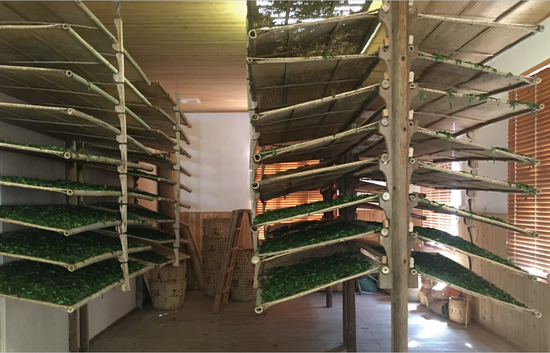 看天做茶,凭经验采取不同的萎凋方式,将茶青均匀摊于竹匾上,采用室内自然凉青(萎凋)或室内、室外复式萎凋。至青叶色泽转暗、青草气稍退、手握成团打开即散。