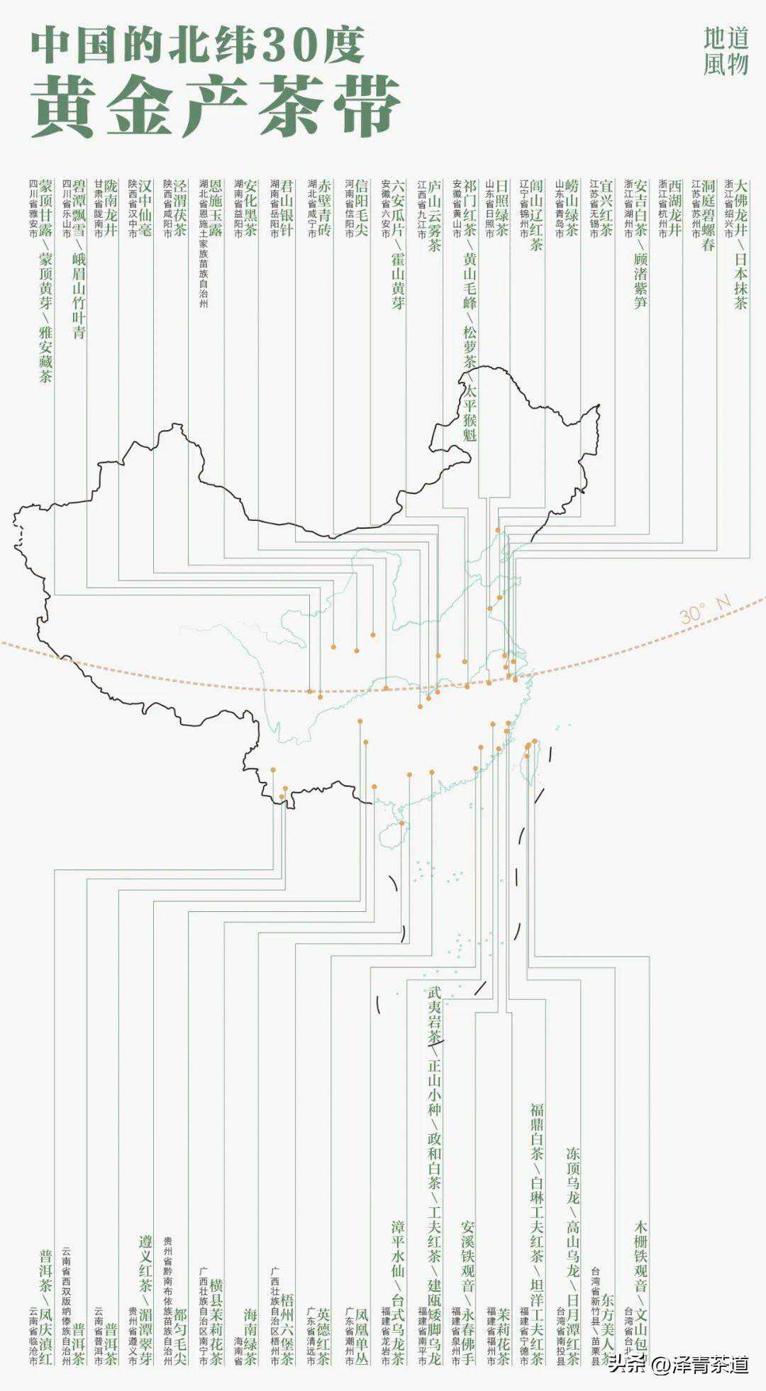北纬30度线在中国境内自西向东,是世界著名的优质黄金产茶带,而中国大致有60多种茶叶都分布在这块优质茶叶黄金生产带上!在这条黄金产茶带上,大抵可以勾勒出两个优质茶叶大产区:
