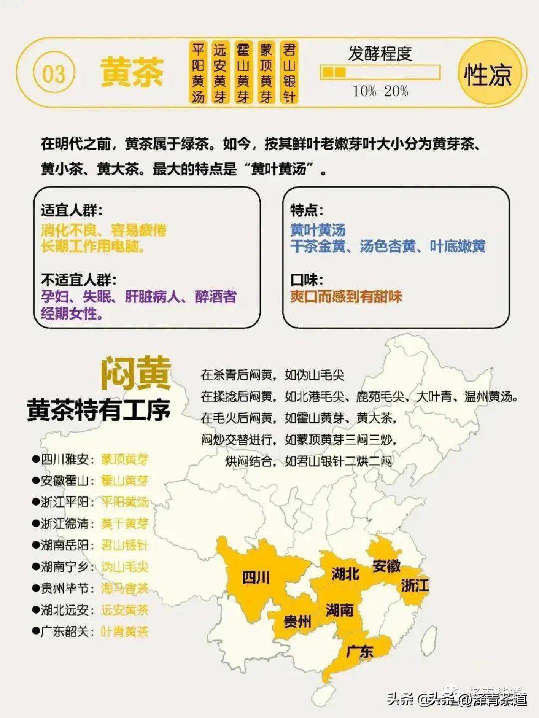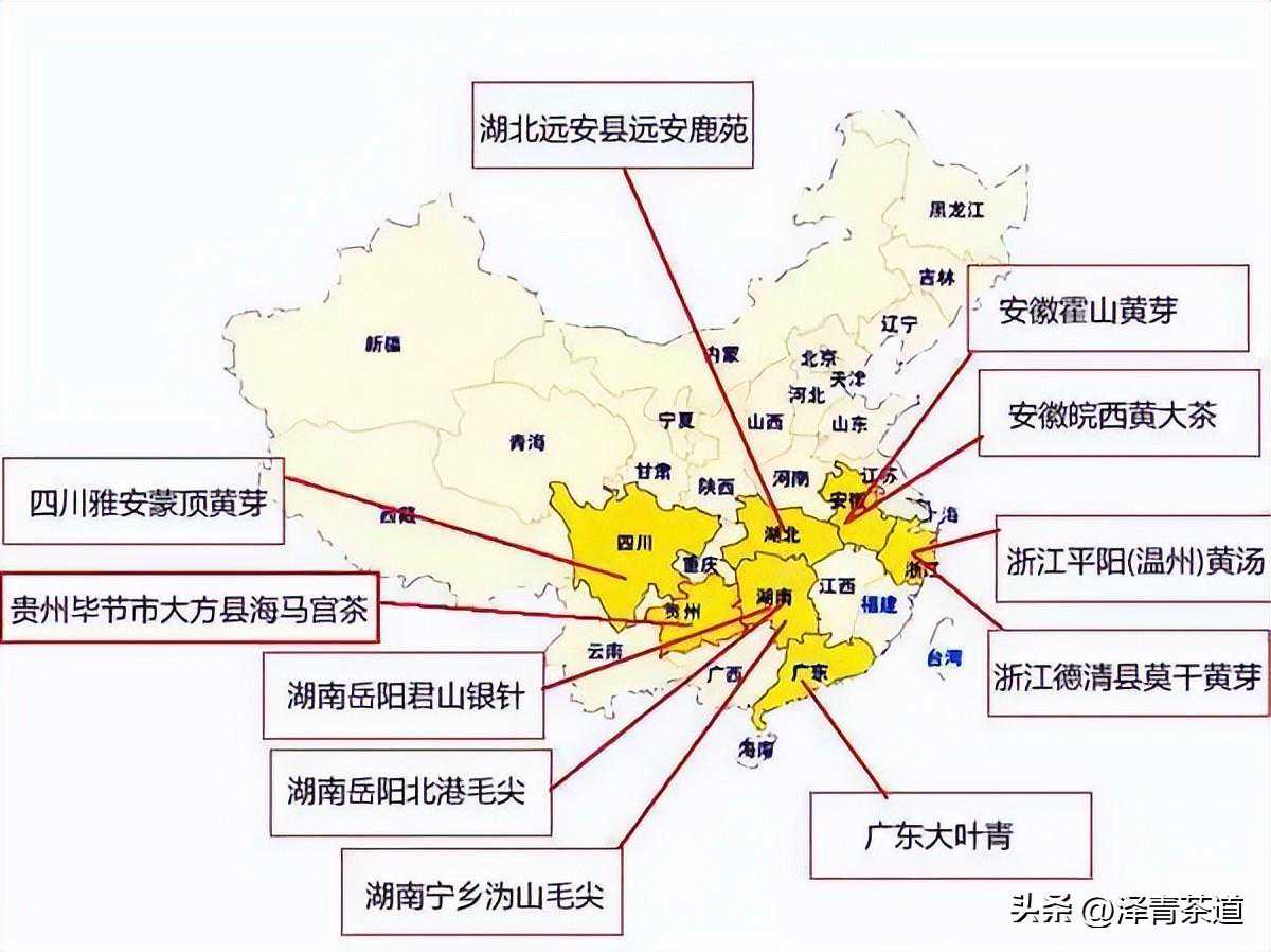 黄茶为轻发酵茶,按照鲜叶采摘的老嫩程度不同,分为黄芽茶、黄小茶、黄大茶三种。主要的代表有湖南岳阳的君山银针、四川的蒙顶黄芽、浙江的莫干黄芽、安徽的霍山黄芽等。黄茶因为其知名度不高,而且制作难度高,在市场上很少见,因此品类比较少。