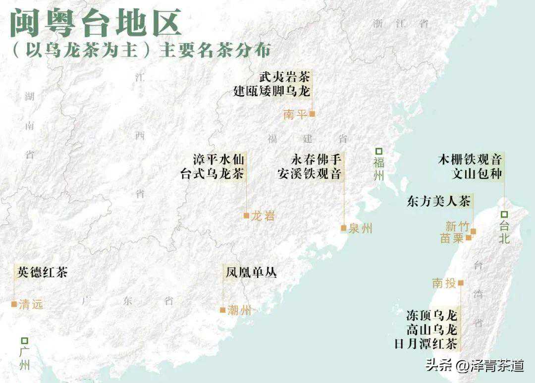 福建、广东、台湾盛行工夫茶,说到工夫茶,是指用小壶小杯冲泡饮茶的方式。乌龙茶最适合用工夫茶的方法冲泡,乌龙茶起源于福建,后引种并传入广东潮汕地区和台湾。工夫茶盛行的福建、广东、台湾,自然也是乌龙茶的主产区:福建的南部有铁观音,北部有武夷岩茶;广东的凤凰单丛茶最有名;台湾以各座山上的高山乌龙茶闻名。