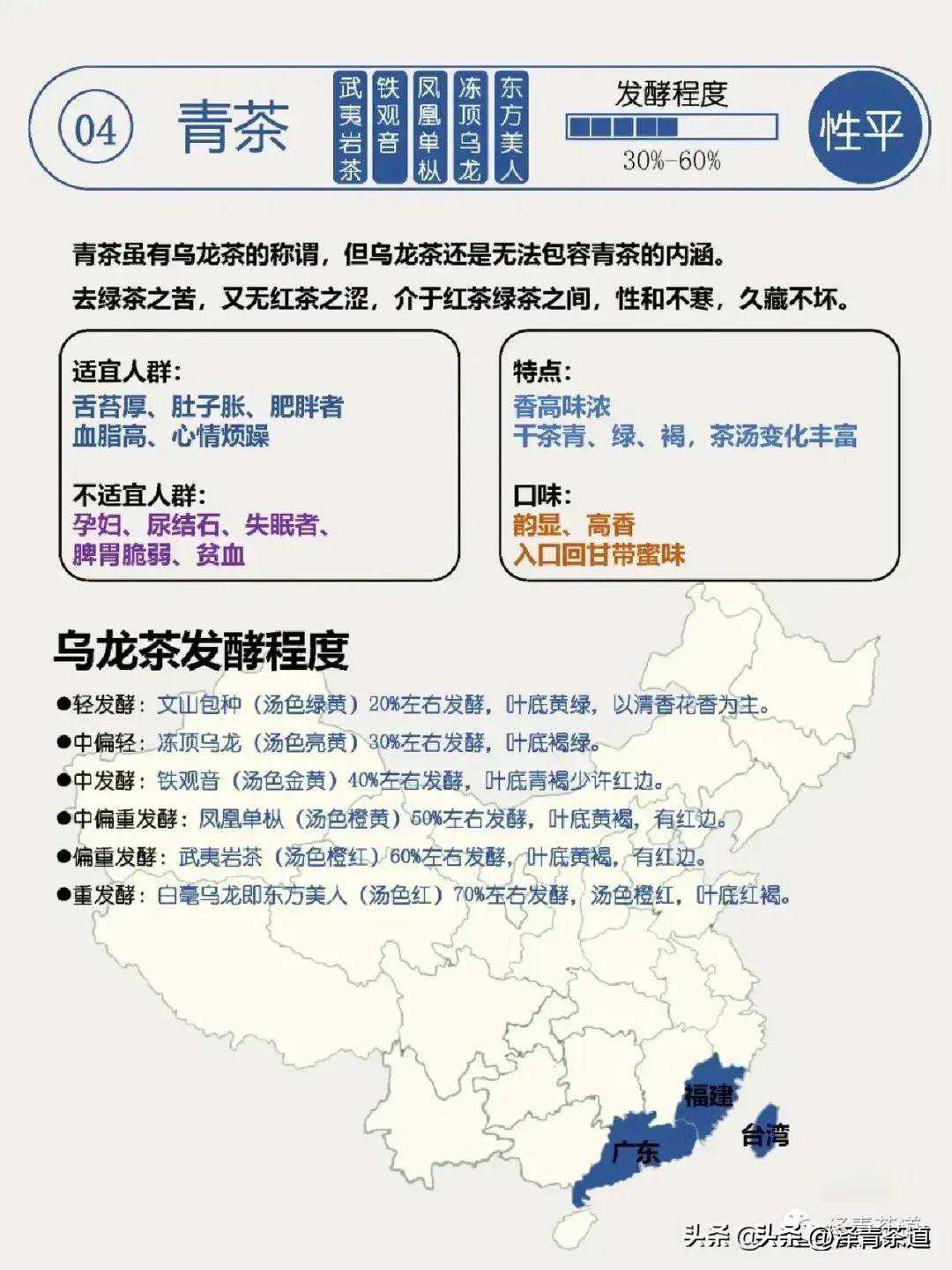 青茶,也称为乌龙茶,兼具绿茶的清香和红茶的醇厚,是半发茶,主要产于中国的福建、广东、台湾等地。