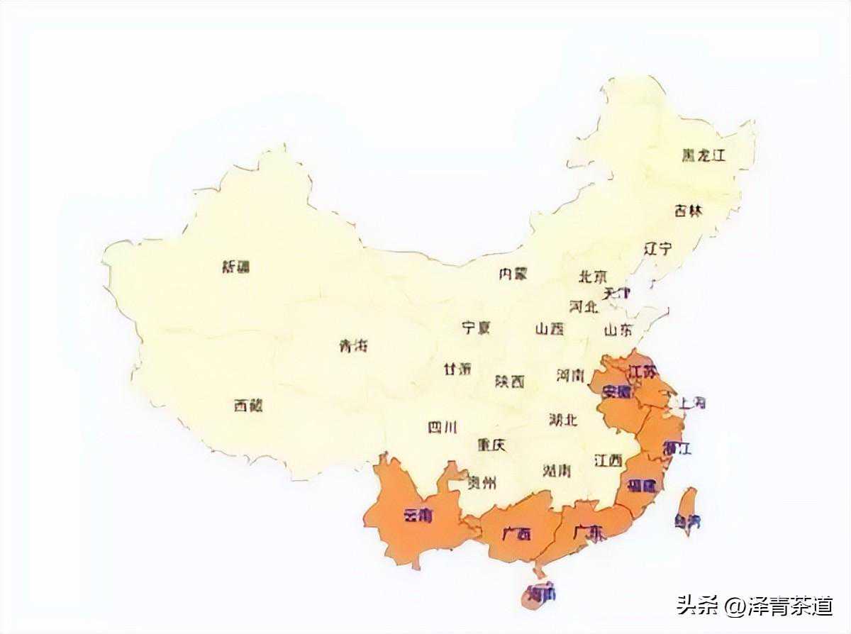 中国的茶区分布极为广阔,南自北纬18°附近的海南五指山,北至北纬38°附近的山东青岛,所占纬度达20°;西从东经94°附近的西藏林芝,东迄东经122°的台湾宜兰,横跨经度约28°。南北东西中,纵横万千里,种茶遍及浙江、湖南、四川、福建、安徽、云南、广东等19个省1100余个县、市。