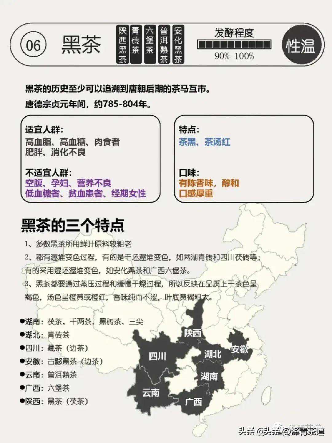 黑茶,为后发酵茶,主要产于云南、四川、湖南、湖北、广西、陕西、安徽(古黟黑茶)等地。产黑茶的地区,也比较固定,产量比较大的主要有湖南、湖北、四川、云南、广西等。黑茶在历史上一直都是供给边疆少数民族地区,因为边疆地区蔬菜少食肉多,为了帮助消化食物和平衡营养,需要多喝茶。