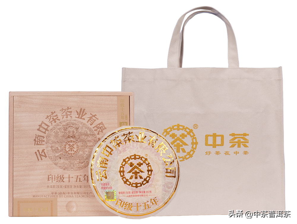 中茶龙藏印级十五年纪念版普洱茶,整体焕新升级。重要标志重要标志之一,是在茶饼棉纸包装、木质礼盒及布艺礼袋上,均有龙纹。
