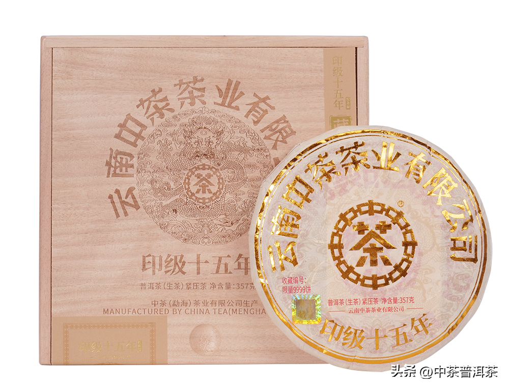 中茶龙藏印级十五年纪念版普洱茶,在饼面上的中茶标志及文字采用了烫金工艺,彰显高贵大气。茶饼包装上还有“十五年陈藏”字标,每饼均带独立编码,限量9999饼!馈赠真情厚意,典藏历久弥香!