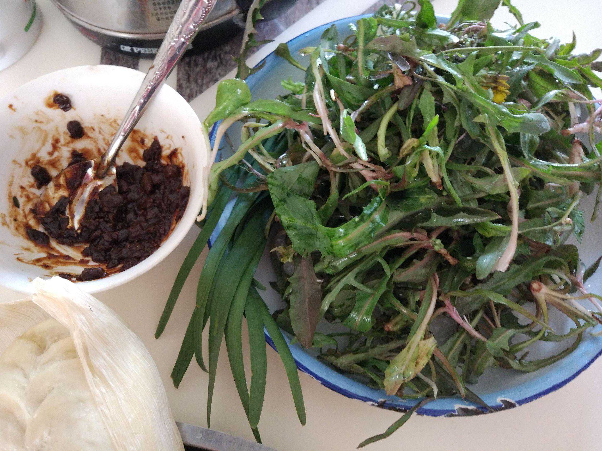 这一小盆蒲公英较多,是留着蘸酱生吃的。我最好这口儿。看着有食欲吧?