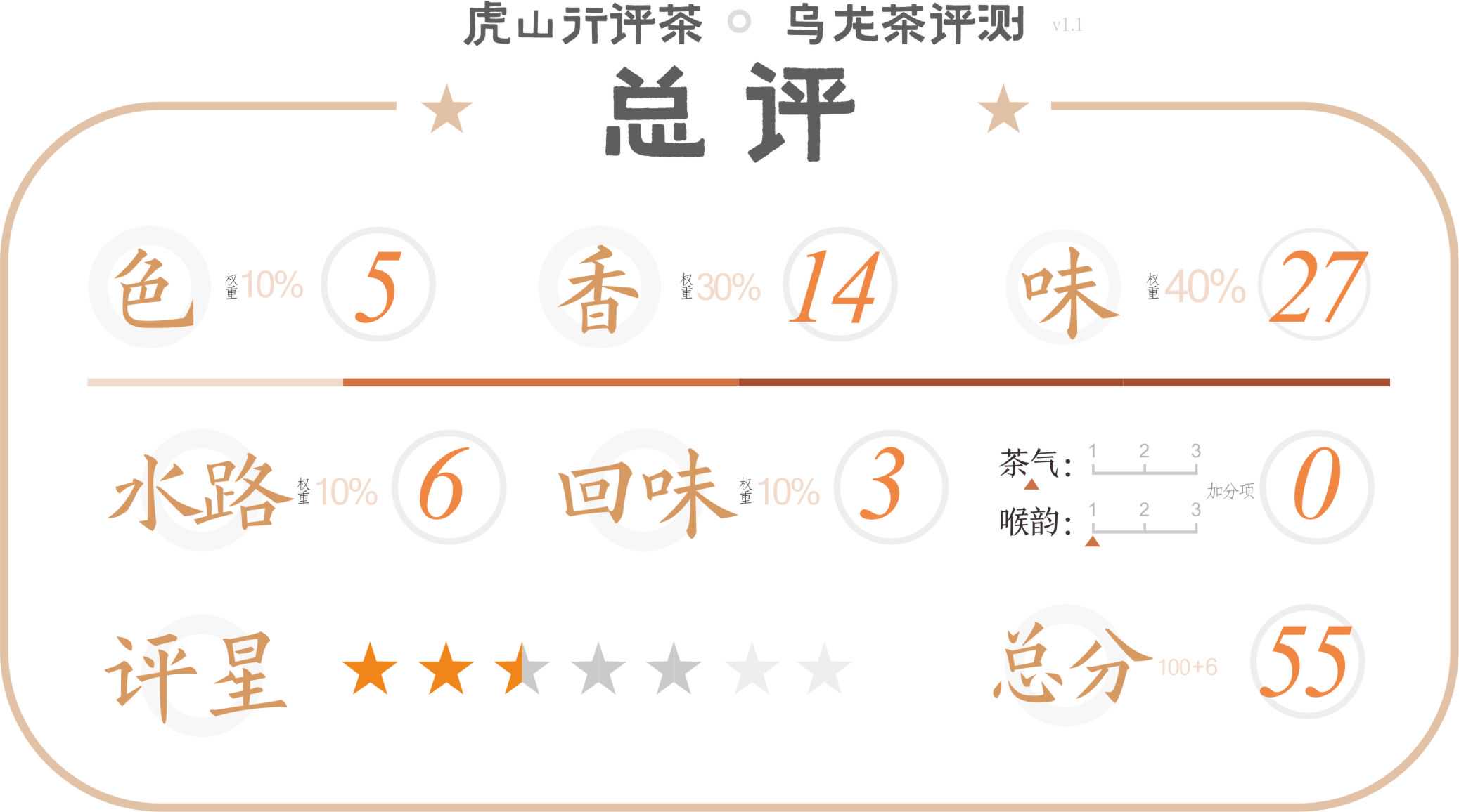 以活、甘、清、香为标准,活为中、甘为下、清为下、香为中下。最终得分为55分,结合目前售价,算是比较中庸的一款口粮,偶尔能喝出不错的汤感。