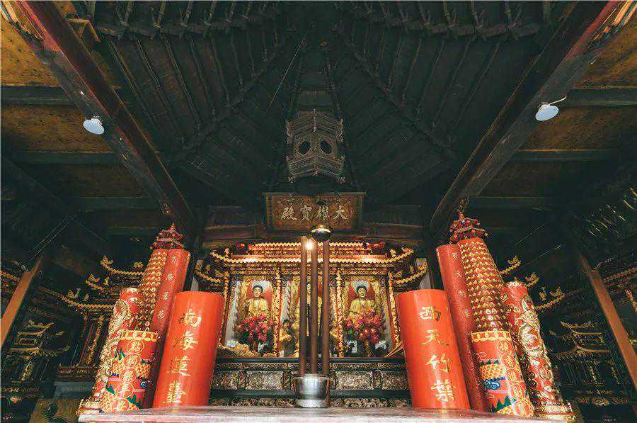 大雄宝殿的八卦吊顶,被香火熏成炭黑色。