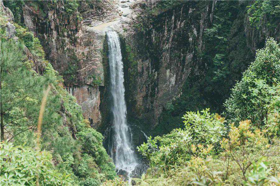 突然,耳旁传来一阵潺潺的水流声,寻声仰望,一席白绢穿山而下,水至清,汇聚成潭。当你以为,这是山体底部时,百丈漈奔腾而下,“栓住”你的双眼,俯视60米的落差,水雾升腾,轰鸣之声不绝于耳。