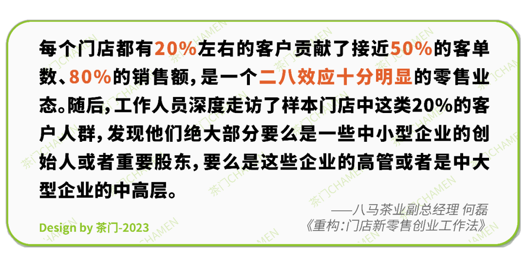 于是,据八马茶业董事兼副总经理何磊,所著的《重构:门店新零售创业工作法》一书所述,八马调取了近一年的销售数据进行分析,最终发现了这些各自不同属性的客群,呈现出了鲜明的“二八定律”1。