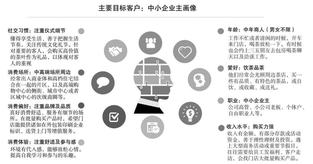 终于,他们定义出了八马茶业的核心客户群体为「中小企业主」。自此,公司、品牌、渠道等等营运工作,都围绕于此展开,整体工作自然事半功倍。