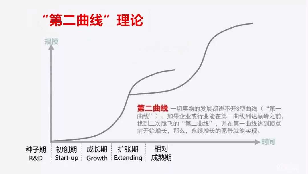 6.第二曲线:当企业某经营要素出现业绩增长拐点的时候,就必须思考通过创新发现“第二曲线”来弥补“第一曲线”即将面临的增长放缓,甚至业绩下降。