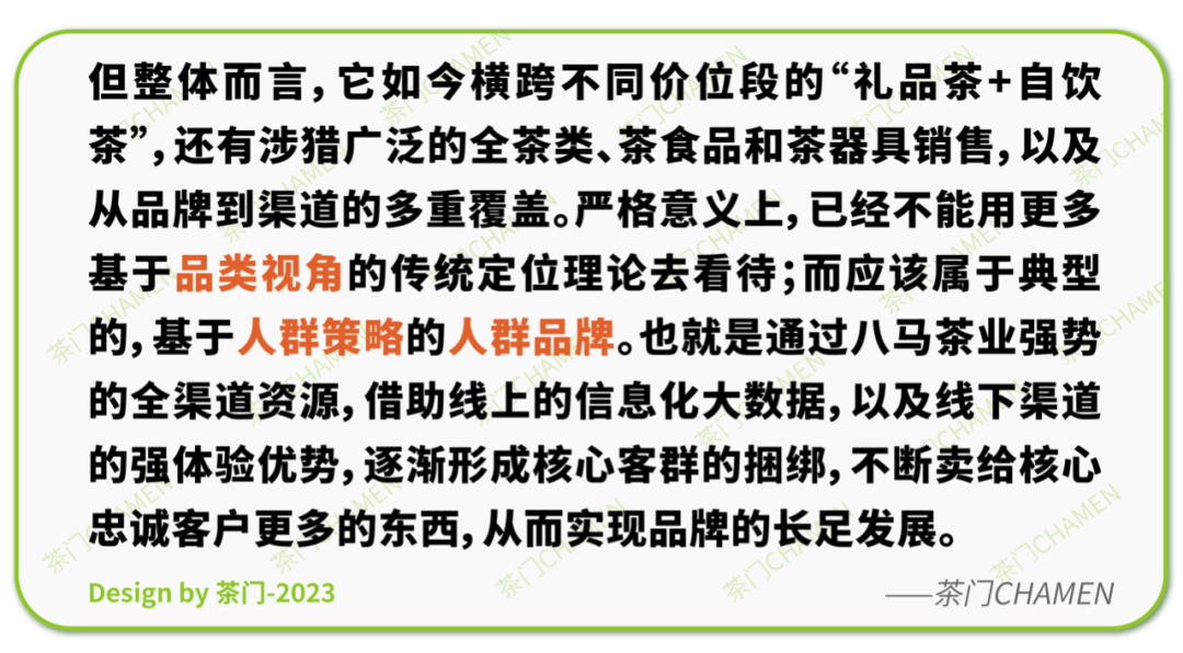 那么,为了品牌增长进行人群扩大的过程中,如果一旦动摇了其中也许是价格、也许是人群属性等某些根基,是否就极易让原本的人群策略瓦解,品牌也渐渐越来越“四不像”了呢?这个度,极难把握。从这个层面而言,八马茶业也仍然还有一段较长的路要走。