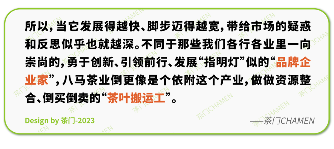 “八马”这个名字,它在“全茶类全国连锁品牌企业”的定义之下,实际已经涵盖了从产品品牌,到渠道品牌,再到一个如今有点包罗万象的“茶业集团”的三重内涵。这极易混淆的三大身份,与我们通常意义上所理解的,能够精准定义、更注重产品开发、而非直接外采贴牌销售的“品牌”(“白牌”倒多是贴牌生产),似乎有那么点不同。