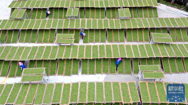 3月26日,茶农在福建福鼎市前岐镇小岳村晾晒白茶(无人机照片)。