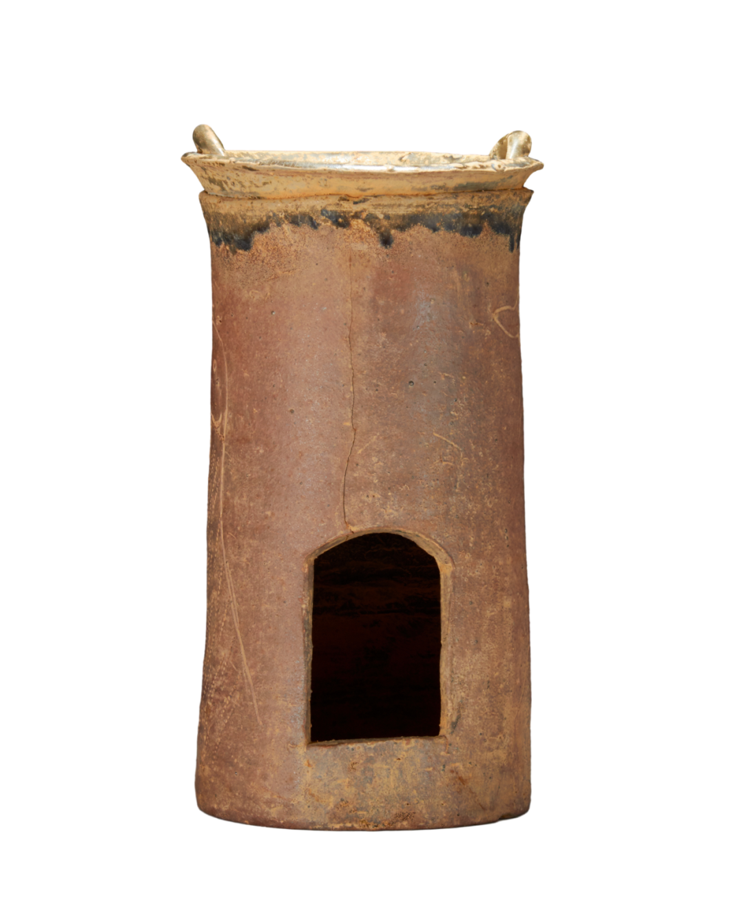 这件邛崃窑酱釉茶鍑及风炉将风炉和茶鍑合为一体,不可拆分。风炉呈直筒状,略高,平底,砖红色胎。腹部开炉门,炉门为壸门式。炉门两侧各刻划半身鸭子,形态自然,活泼可爱。茶鍑折沿,浅弧腹,口沿有两环形耳。炉身不施釉,茶鍑及炉口沿施黄褐色釉。