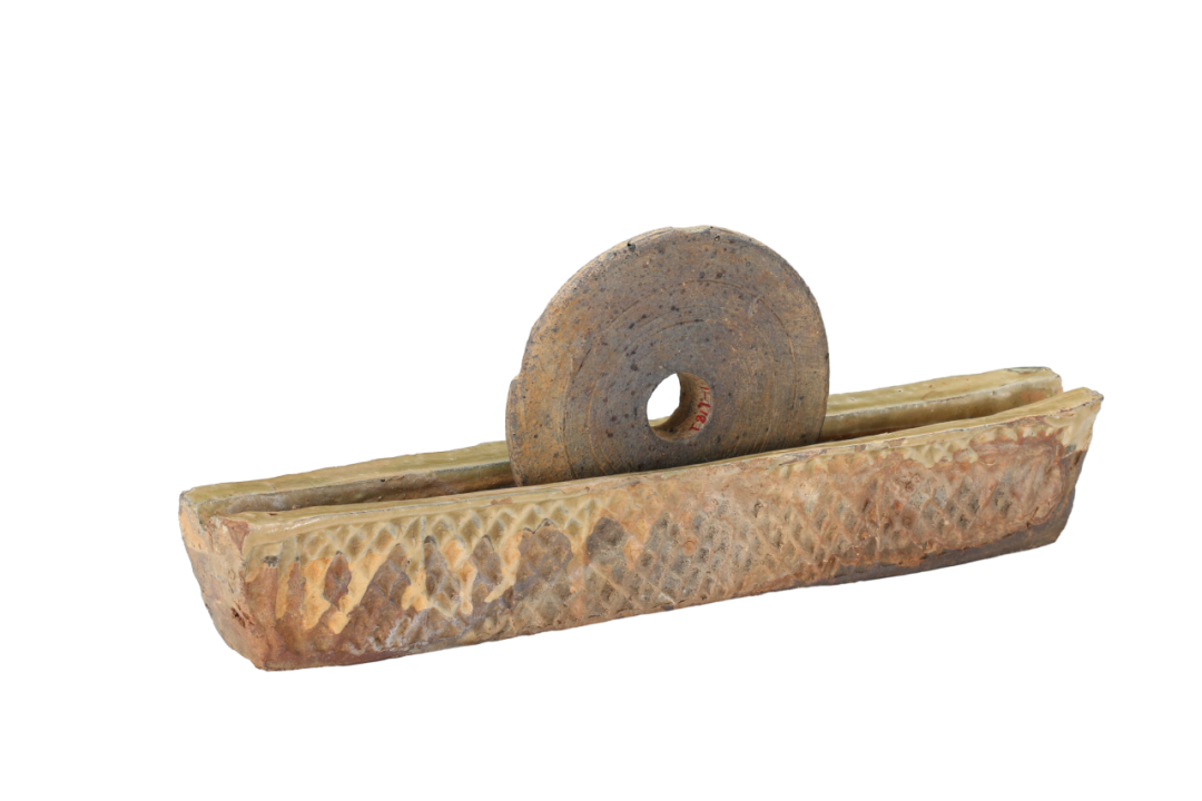 褐釉茶碾由碾槽与碾轮组合而成。碾槽呈船形,中间峻深,以承碾轮。外壁装饰有菱形图案。碾轮如圆饼状,中有一圆形孔用于穿插横柄。