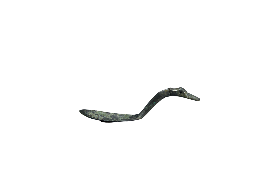 凫首铜匙的匙面为椭圆形,微凹,短柄上翘,柄尾端为鸭首的形状,鸭嘴长扁,眼睛为内凹小洞,整个器物小巧精致,特别是鸭首的制作,线条简单,特征鲜明,展示了工匠的巧心和巧技。