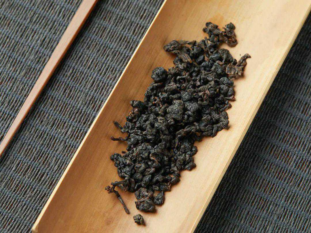 冻顶乌龙的干茶团揉紧实,颗粒完整,色泽墨绿,叶缘呈现一圈朱砂色的红镶边。