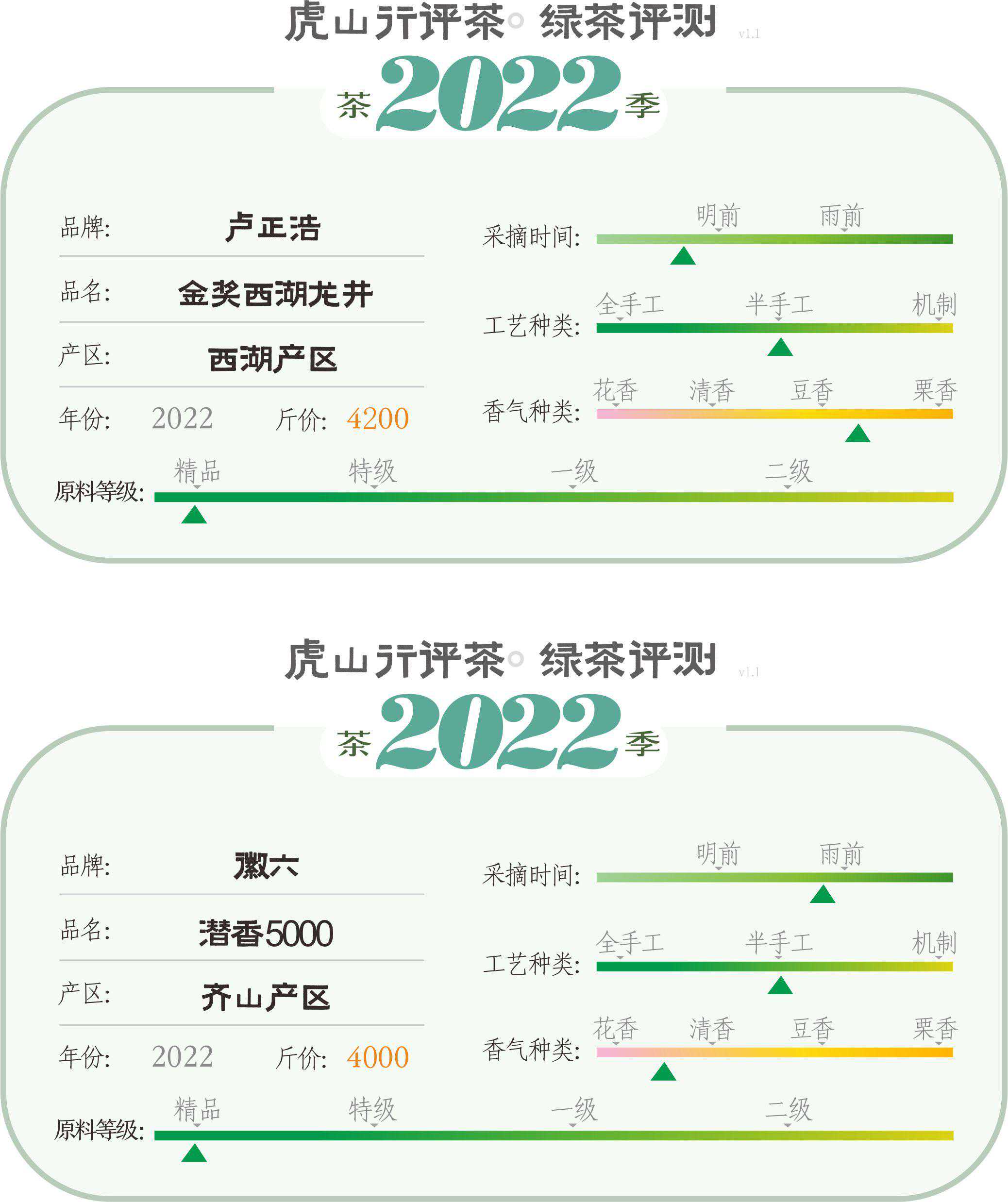 本次选取的是代表龙井的卢正浩金奖西湖龙井,线上购买,合斤价在4000以上,产区标注为西湖龙井一级产区;采摘时间为明前;等级为精品级;工艺为半手工即手工辉锅。代表六安瓜片的是徽六牌潜香5000,采摘时间为雨前,合斤价为4000元。