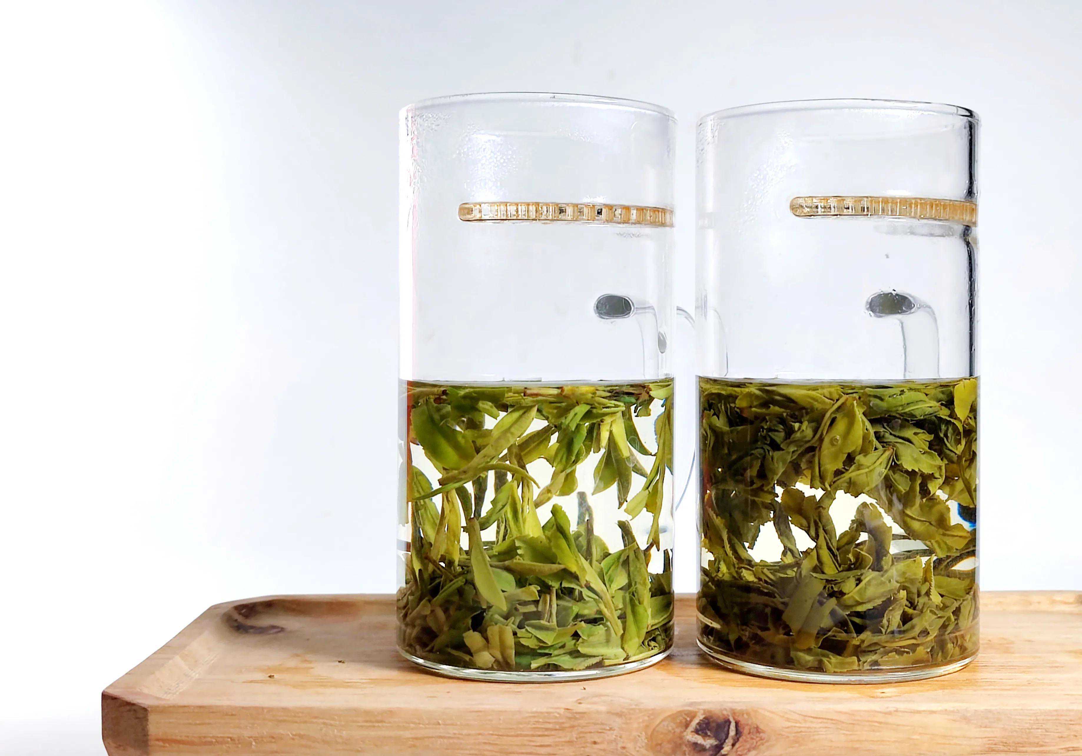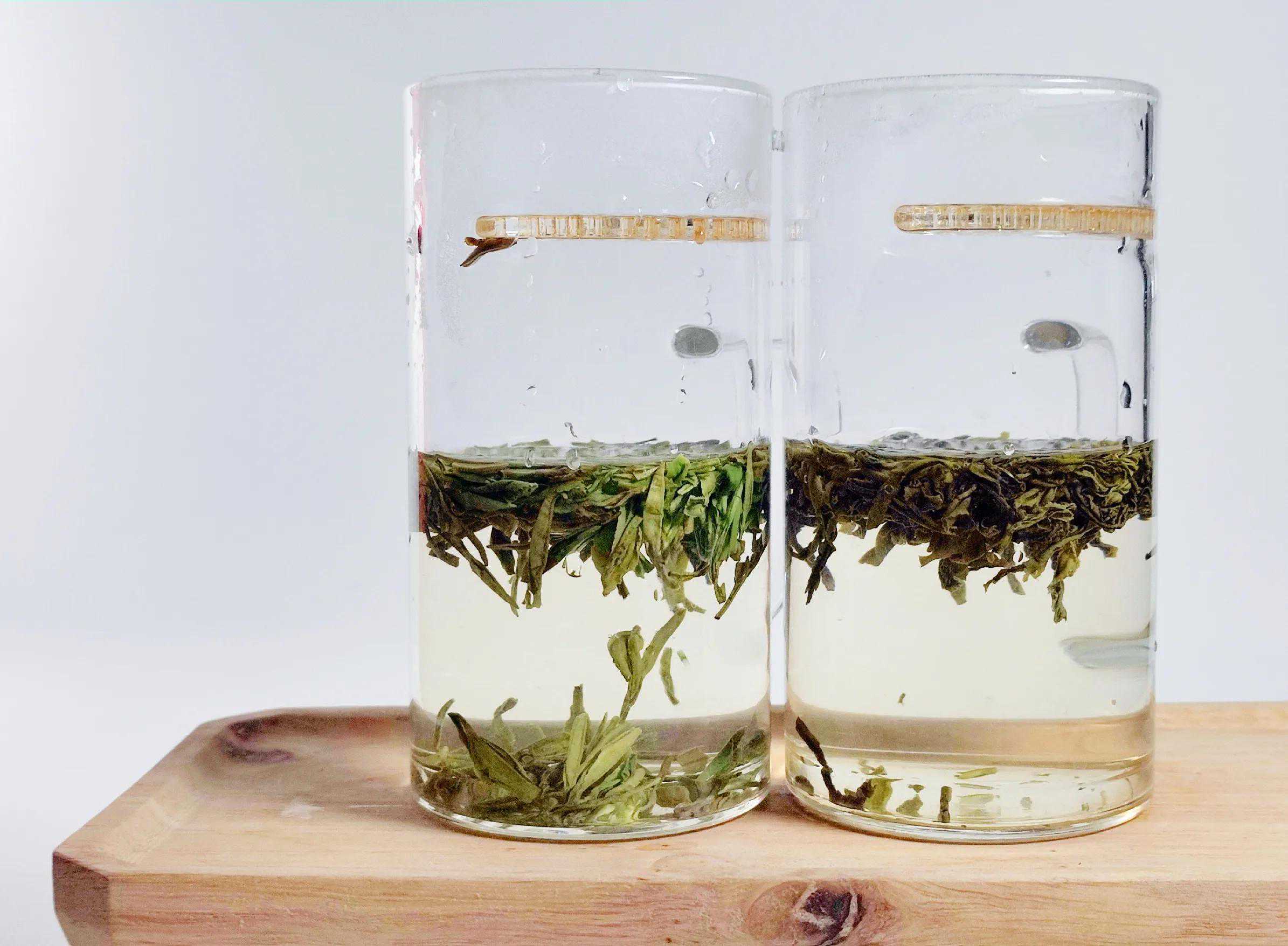 主要指标对比解析:香气上看龙井浓度较强,释放快速,六安瓜片释放得相对更均匀,香气更偏向柔和,龙井香气更鲜浓,浓郁程度龙井明显胜出。
