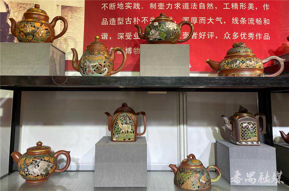 佳茗配雅器,锦上添花。现场展出了宜兴紫砂壶、坭兴陶壶、建水紫陶、建盏、景德陶瓷、龙泉青瓷、河南钧瓷、根雕字画等精美茶具,为市民提供“一站式”的茶品茶具选购体验。其中一组精美的镂空茶壶,吸引了记者的注意。工艺美术师、中国收藏协会理事、紫砂非遗传承人庄涵向记者介绍,这组茶壶是她特意为参展本届番禺茶博会所设计,“这组宫廷风格的茶壶,利用镂空和浮雕设计,采用的是泥绘手法。例如这款‘一团和气’,寓意祥和吉利;这款‘龙凤呈祥’,壶盖上绘画着‘龙凤’,壶身是十二生肖环绕,寓意着龙年大吉。”